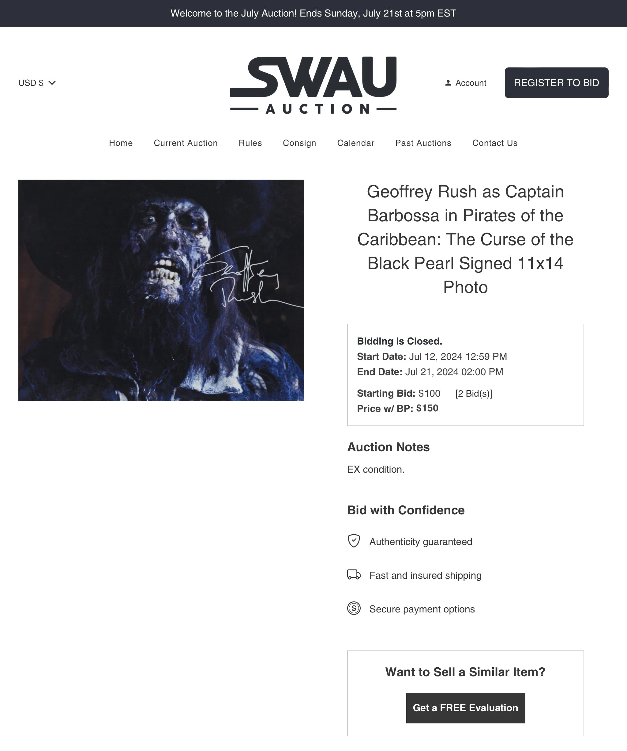 Geoffrey Rush signed 'Pirates of the Caribbean' 11x14 photo July 22, 2024 Sold @ SWAU ← Bill Nighy signed 'Pirates of the Caribbean' 11x14 photoTippi Hedren signed Alfred Hitchcock's 'The Birds' 11x14 photo →